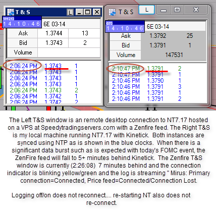 Regarding the connection drops, and the lagging feed, we can confirm from the time and sales window and PC clock in your screenshot that Zen-Fire was sending the ticks at the correct time.