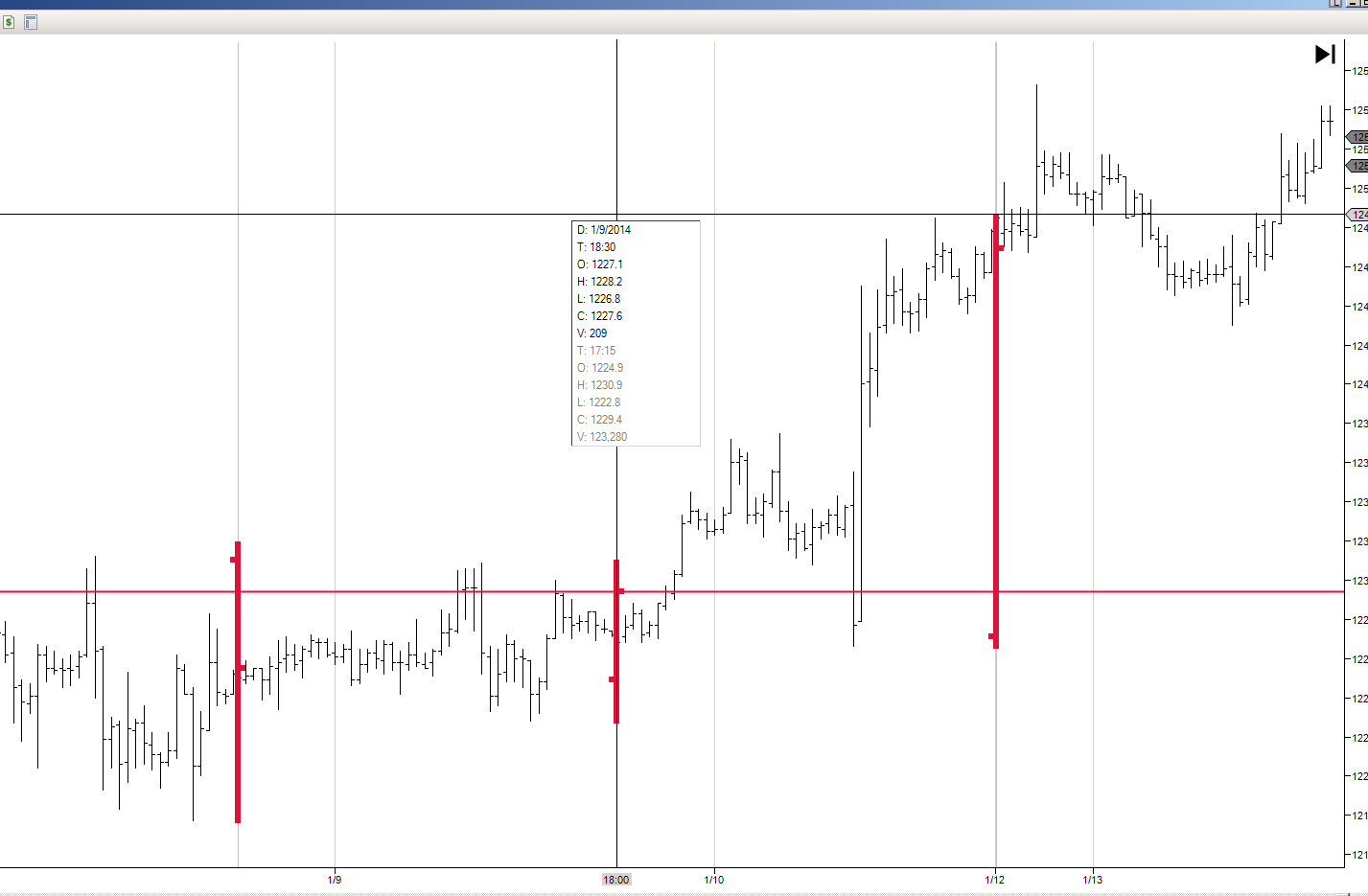 09-Jan-2013 Daily : it Closes @1229.4$ (marked with red horizontal line) , but that does not have corresponding read on the 30 minutes bar at any time near the session's end @18:00 even within the range of +-2 hours