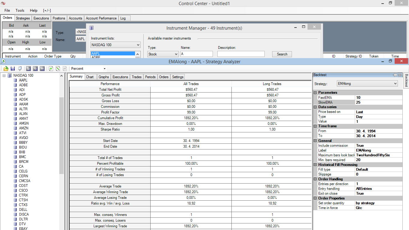 2. Strategy Analyzer - selected instrument, run backtest