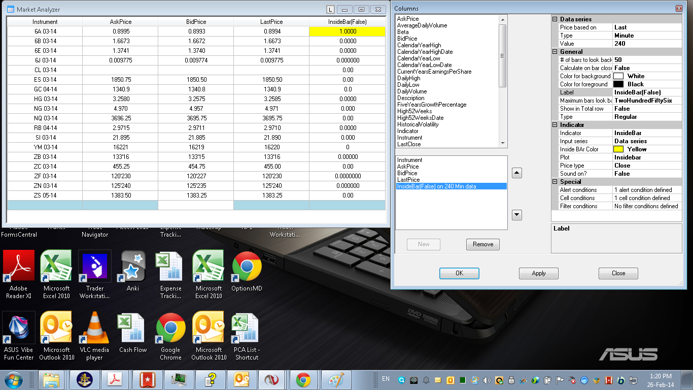 I've got the indicator and alerts working in the Market Analyzer (MA) using the daily bars I want to look at but when I call the charts up from MA using the "send to" option it defaults to one minute bars. How do I change the the "send to" default to daily bars?Last edited by Gennaker; 04-20-2014, 06:49 AM.