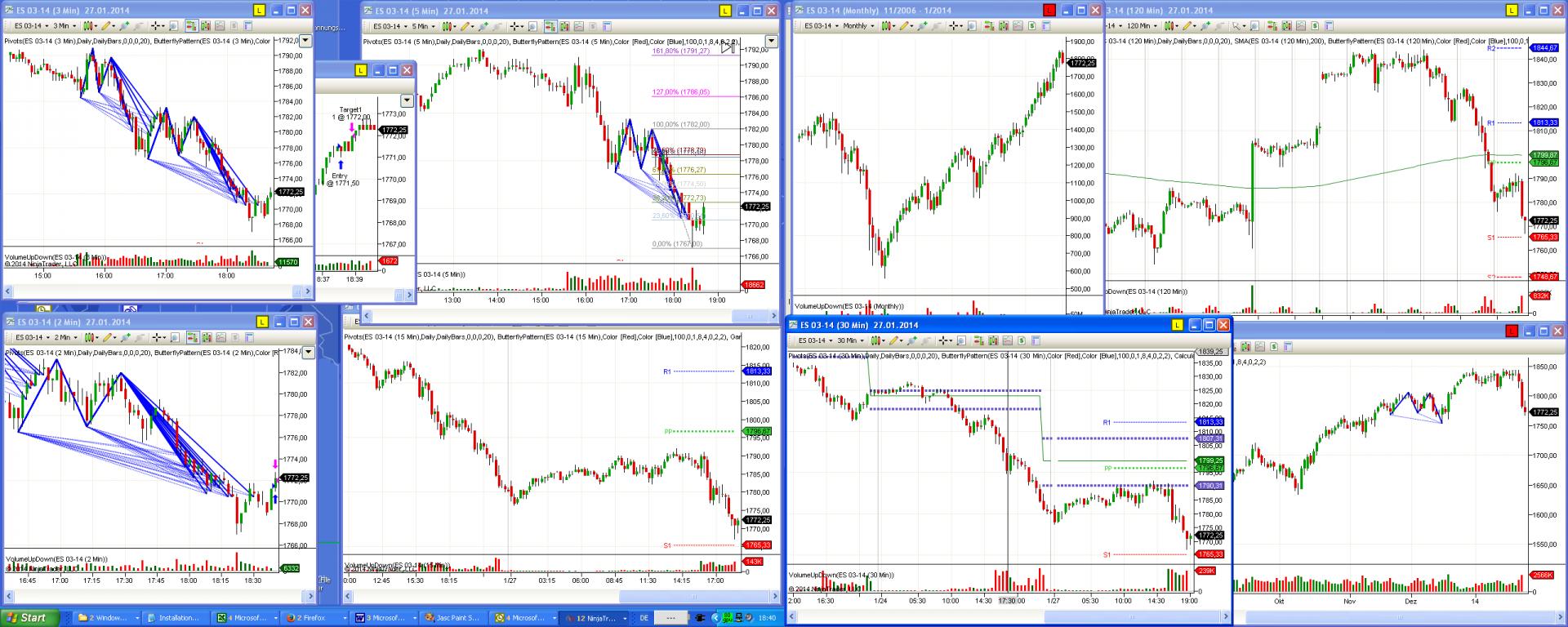 I use just a few indicators: Volume, Pivots and 2 own indicators for pattern recognition. Just in the 30 min chart there’s another one for calculation the Value Area. There is currently no backtesting, no strategies and no automated trading, just a lot of live-charts, live-trading.
