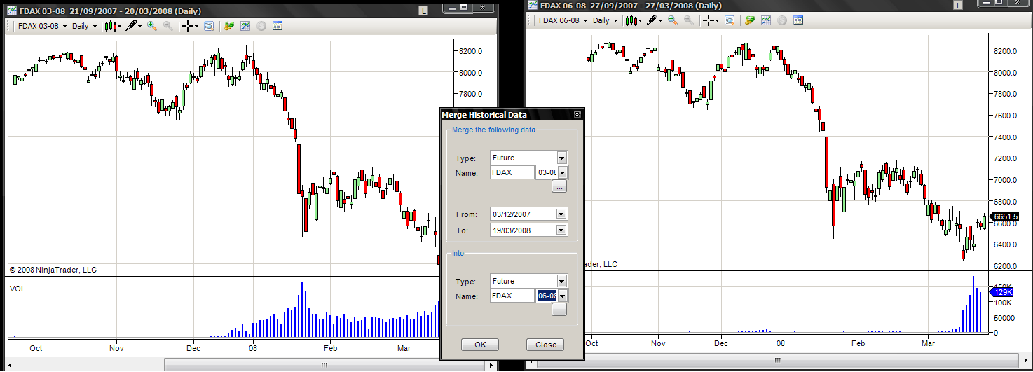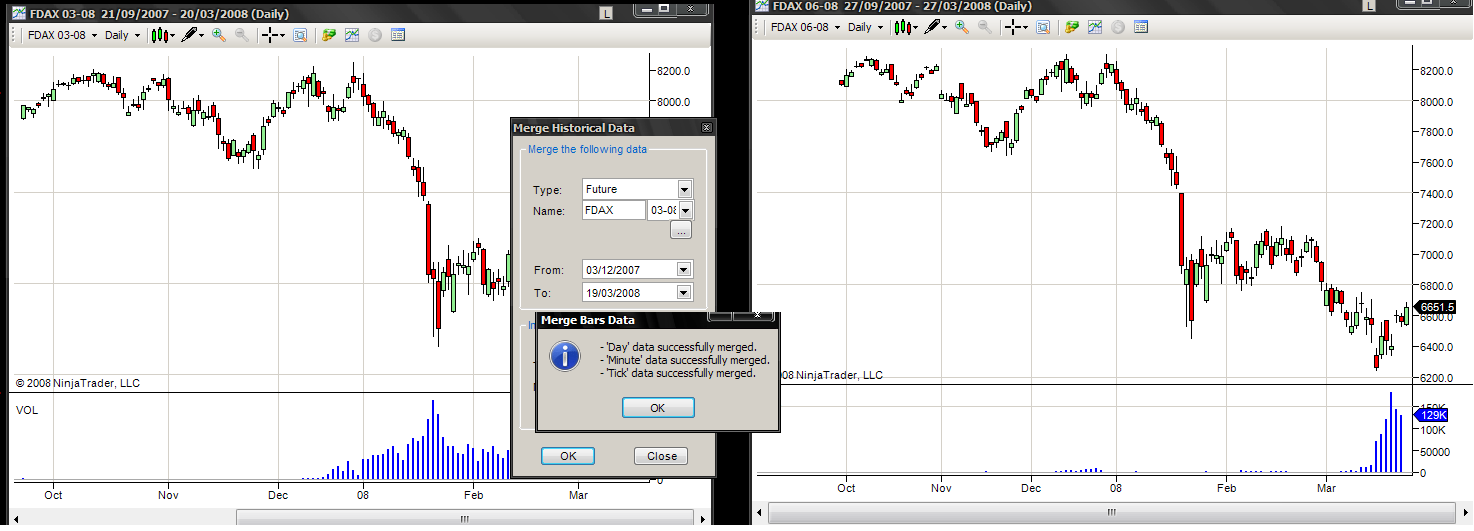 I tried to use the merge function to build a continuous contract on the Dax by merging the data from the march contract into the june contract. At this point Esignal feed is disconnected and the merge function works ok.