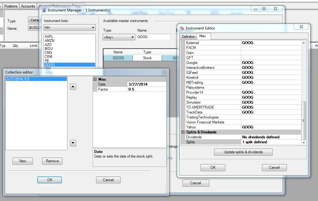 Thanks in advance for the help. I am trying to do a very simple thing - make sure that my GOOG (Google) stock split is accounted for in NT. I also have a KINETIK subscription for historical data. I tried clicking the update dividends and splits - and it seemed to "grab the data" in the section. I also adjusted it manually (screenshot attached). However - If I backtest my strategies - or if I just bring up the chart - it doesn't seem to work - it just shows the price down at $500 and change.....