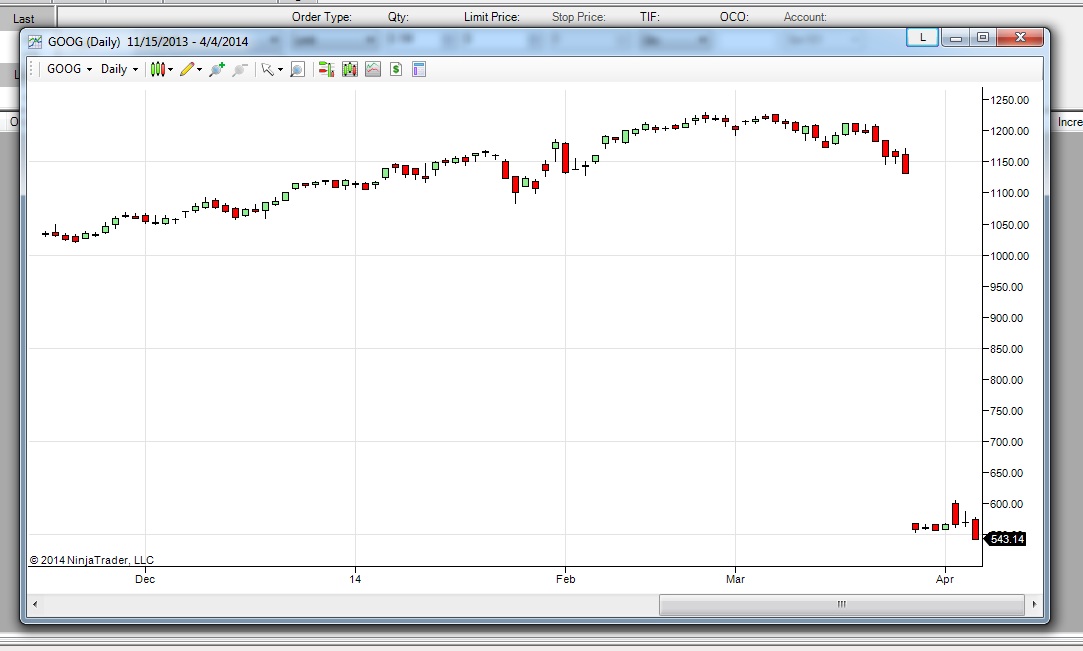 Wow, thanks for the help - this has fixed the historical chart - so it all shows up as prices from google divided by two prior to the split date. However, my back-testing strategy seems broken. Looks like entries seem fine, but exits, trailing, etc seems to be broken... weird. My strategy seems to work just fine with other stocks (PCLN for example) who don't have a split just fine. I know there's not much to go on - but any ideas on why a stock split would break a back-testing strategy. Weird thing is - it work just fine on GOOG (albeit - it doesn't have accurate values as the stock just drops to $500 at time of split), but for GOOGL is broken. I checked - I don't explicitly load a symbol by name anywhere, so that's not the issue.