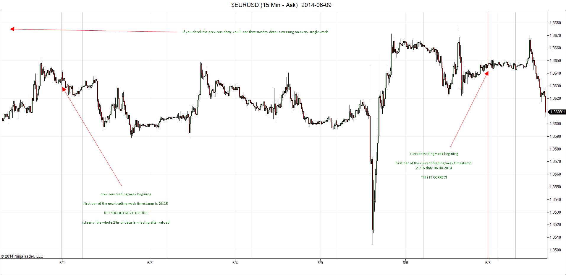 Check the attached chart, it is 6/1 EURUSD ASK 15m, please note the timestamps of