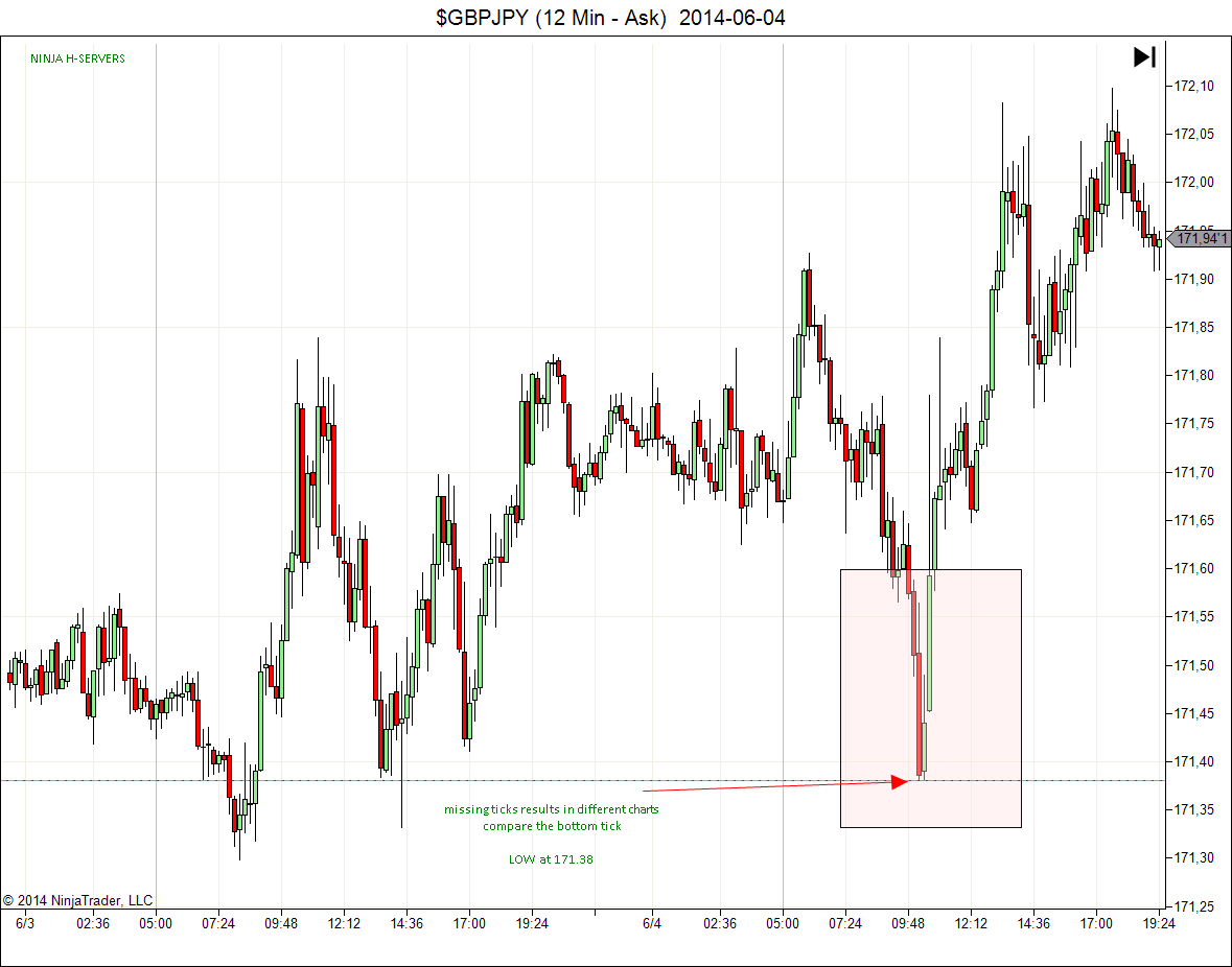 As an example I've attached three charts of GBPJPY, the one with misiing tick was populated using ninja history servers, the other one is correct, just compare the data.
