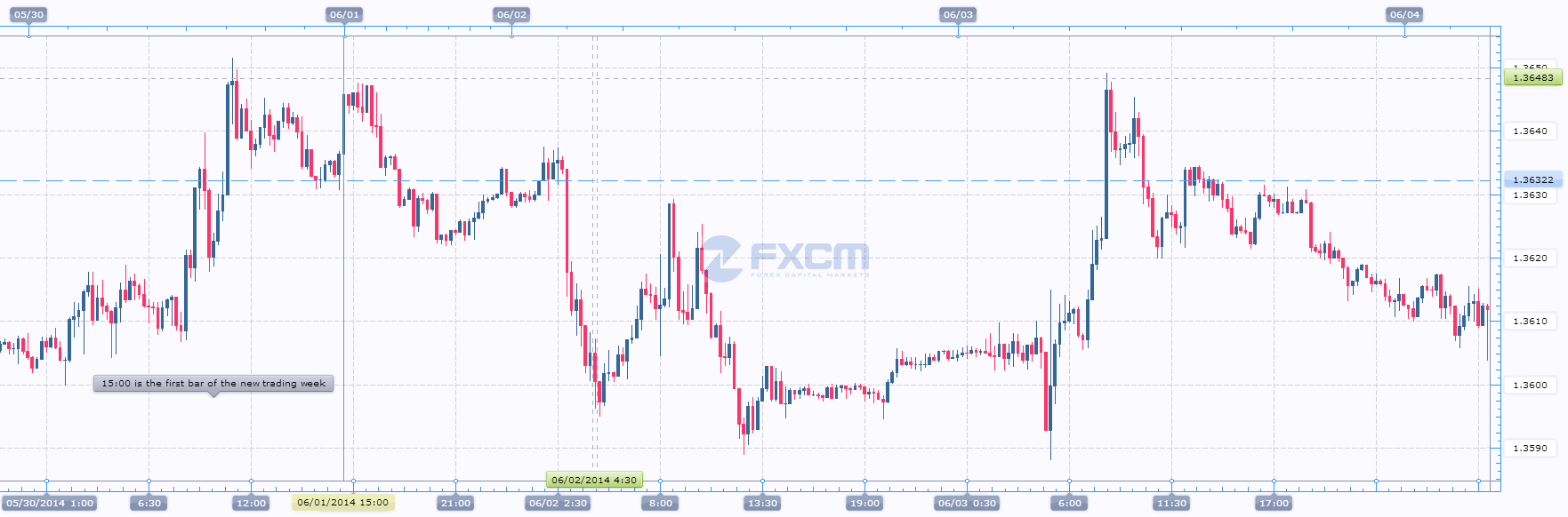 - for the date of 06.08.2014 (current trading week) the first bar timestamp is 21:01