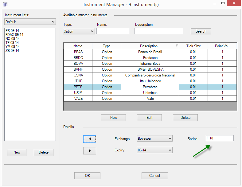 Once added select the left arrow button to add the instrument to the selected instrument list. Once options expire you will need to roll forward the instrument, to do this follow the below guide: http://www.ninjatrader.com/support/h...es_contrac.htm