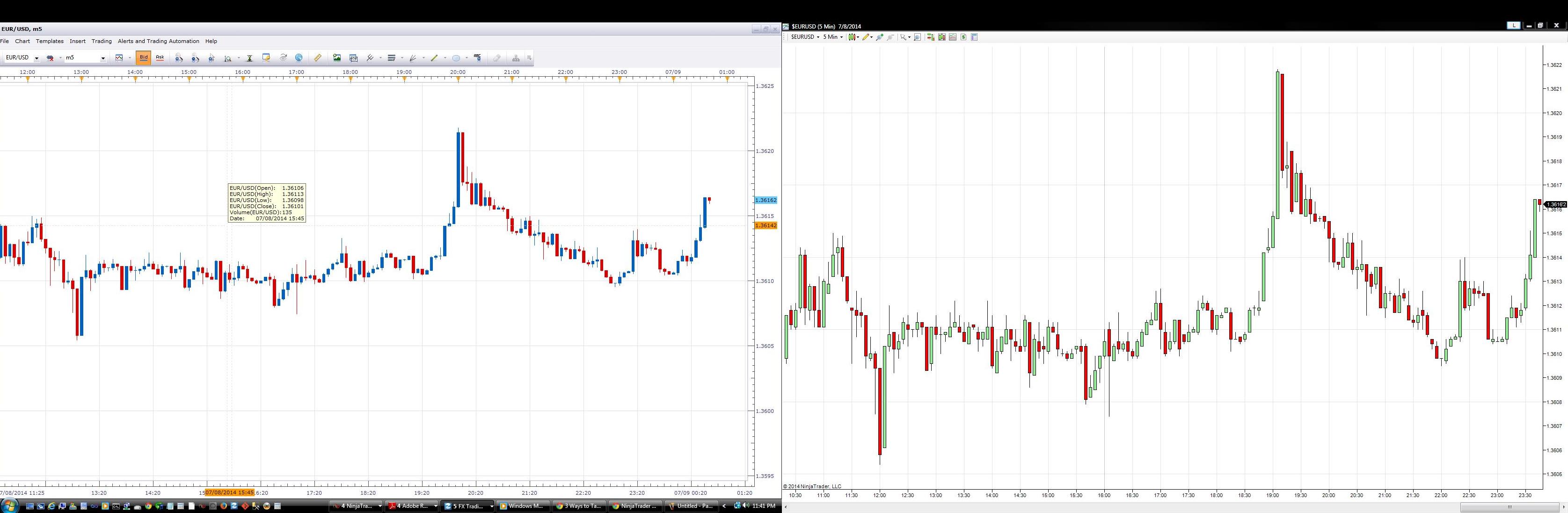 the prices aren't the same example: NinjaTrader 07/08/2014 19:10 High 1.36216, FXCM 07/08/2014 19:10 High 1.36218