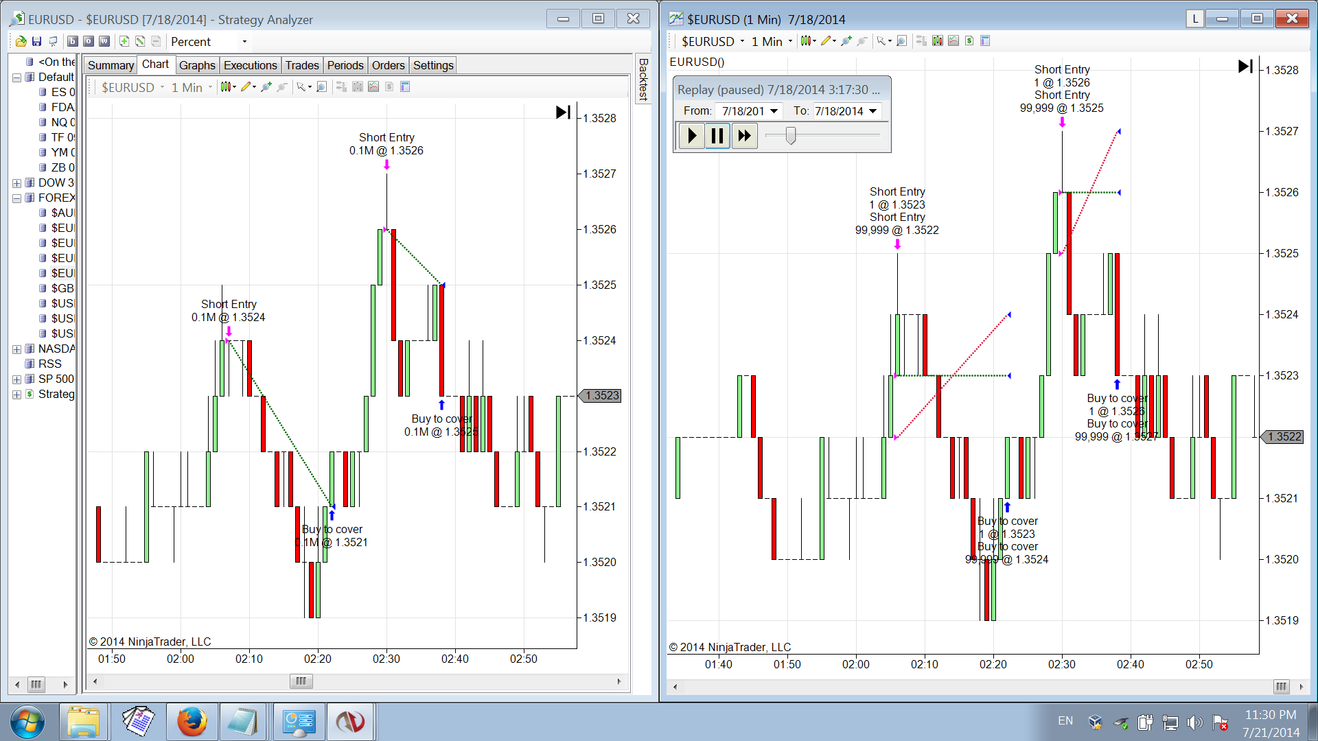 I have a simple 1 minute EURUSD Forex Strategy that I have ran in the backtest environment and on the market replay.