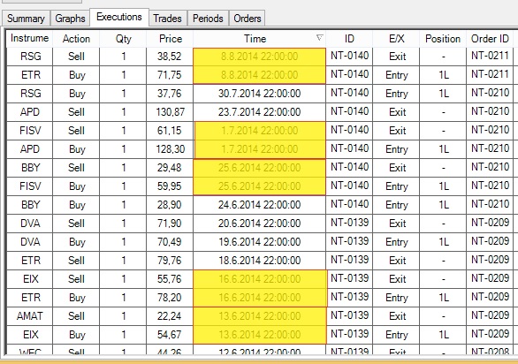 Expected behavior: when the trading day starts it checks whether the market position is flat. If not, then nothing happens. If the positions is flat it goes through all the possible symbols and if one of them triggers the entry rule then long position is entered