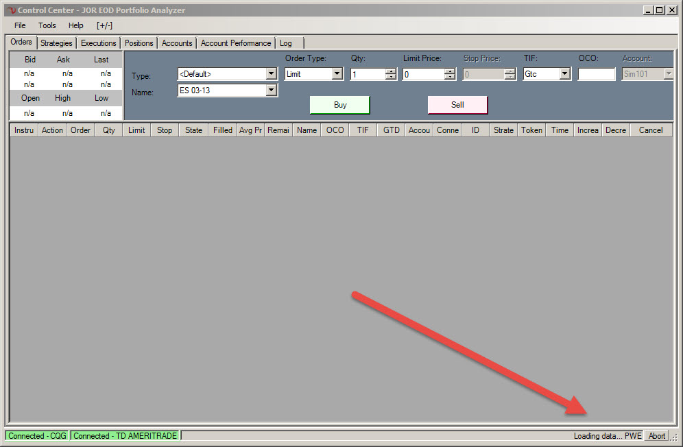 This is a reproducible problem. I am trying out TD Ameritrade for stock data. I have a list of symbols in a Market Analyzer window. It loads some of the symbols but seems to be ""stuck". When I quit and reload Ninija, which is the only way to get it going again, It will stick loading data again. Not always on the same symbol, so I am assuming it is not a particular symbol with issues. Please advise. I have attached 2 screen shots, one showing the Market Analyzer window, and another showing the Control Panel with the status on the bottom. I am able to press abort, but it does nothing. I am also able to make menu selections within the control panel, like disconnect and exit. What does not work is if I select a symbol it does not load into the other chart windows, which I have linked. I am leaving it in the "stuck" state, in case you want a dump or to link to my system.