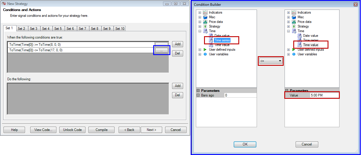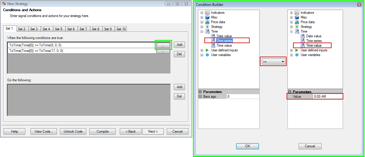 In the strategy wizard there is a “Time” tab and the choices on the drop down are “Date value”, “Time series” and “Time value”. I choose “Time value” and cannot figure out how I set it up a condition equal to this: time > 800 and time < 1700;