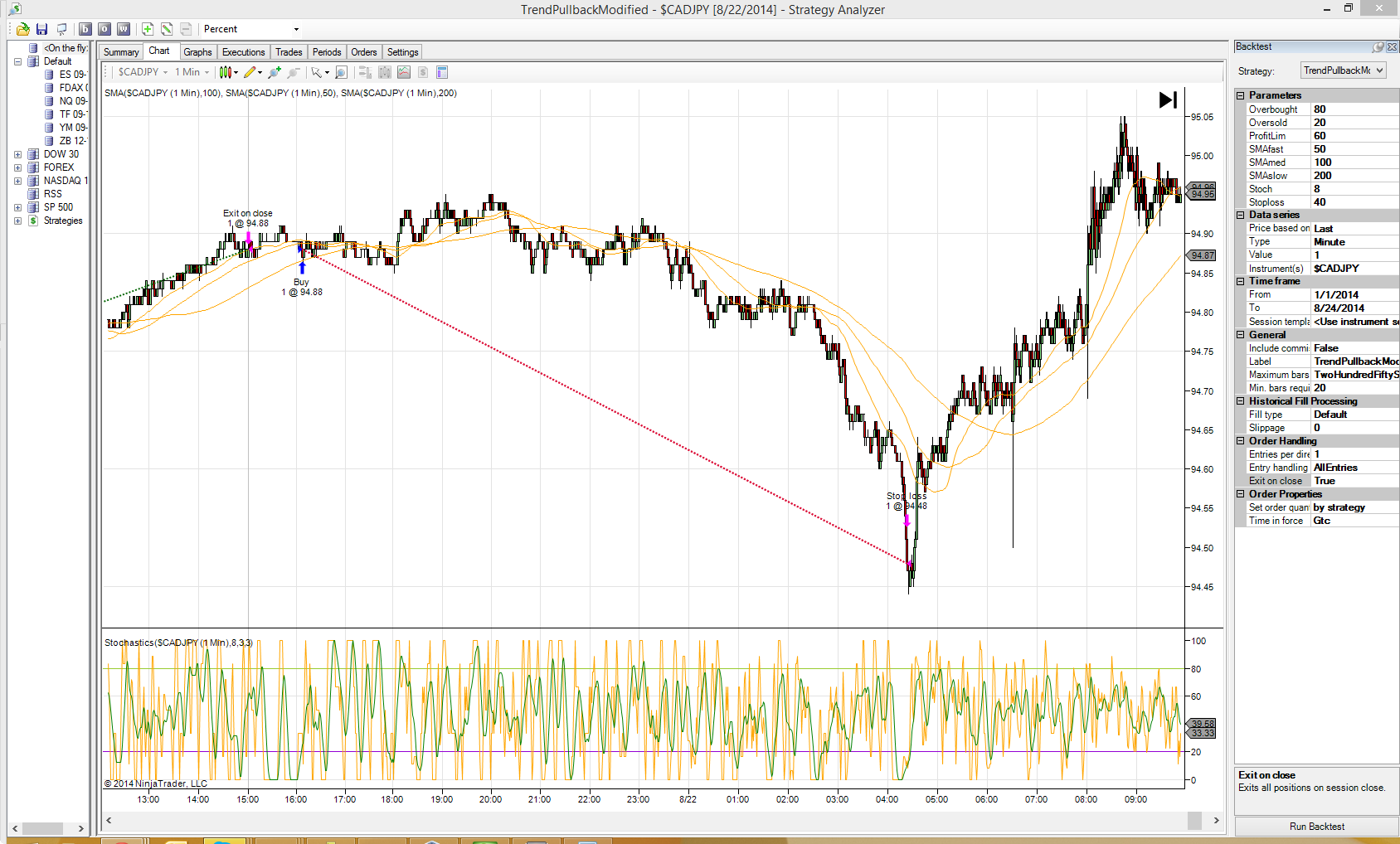 However, from my testing, I am finding that the stop loss is closing orders when the price drops 40 ticks. This screenshot is taken with Exit on close set to True.