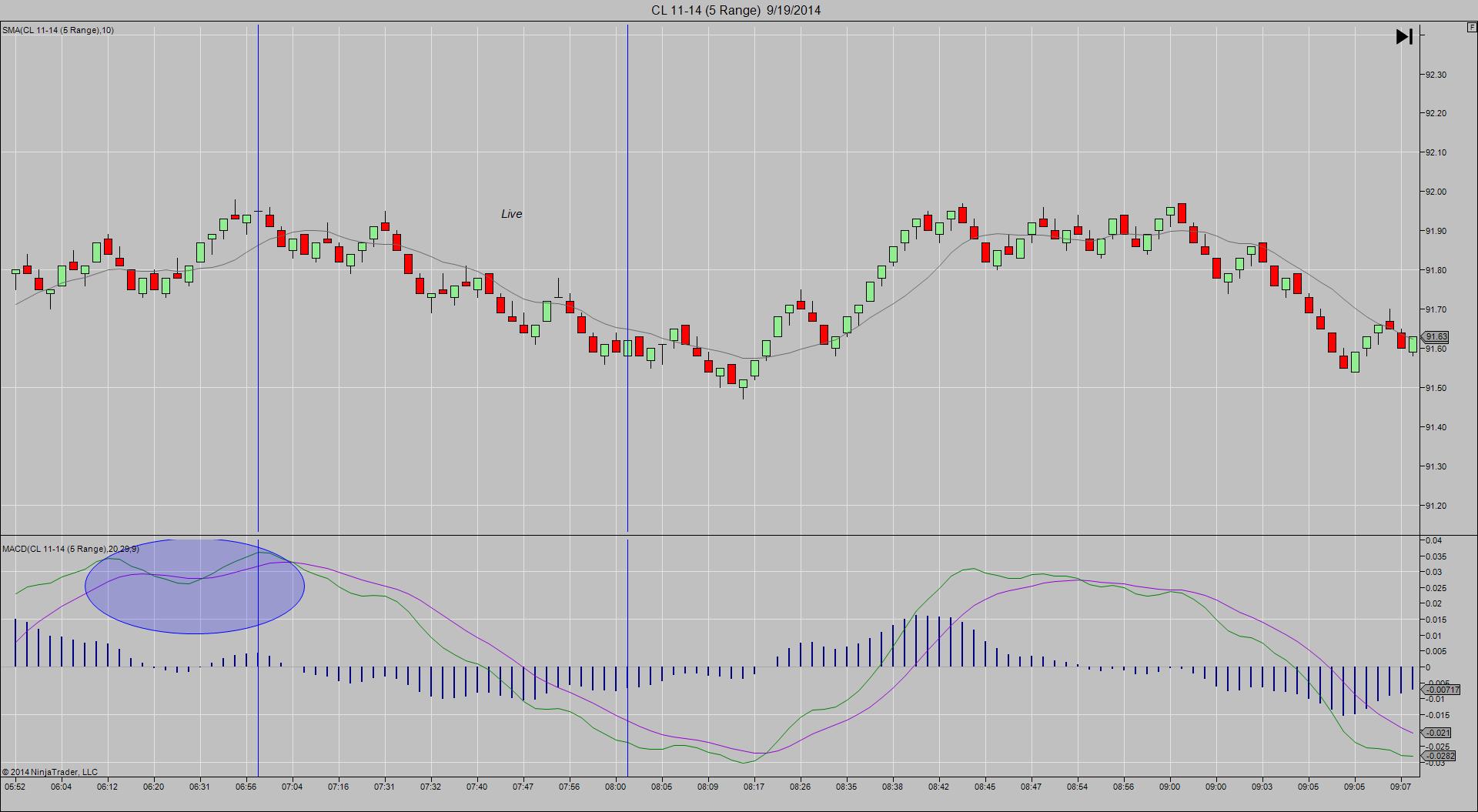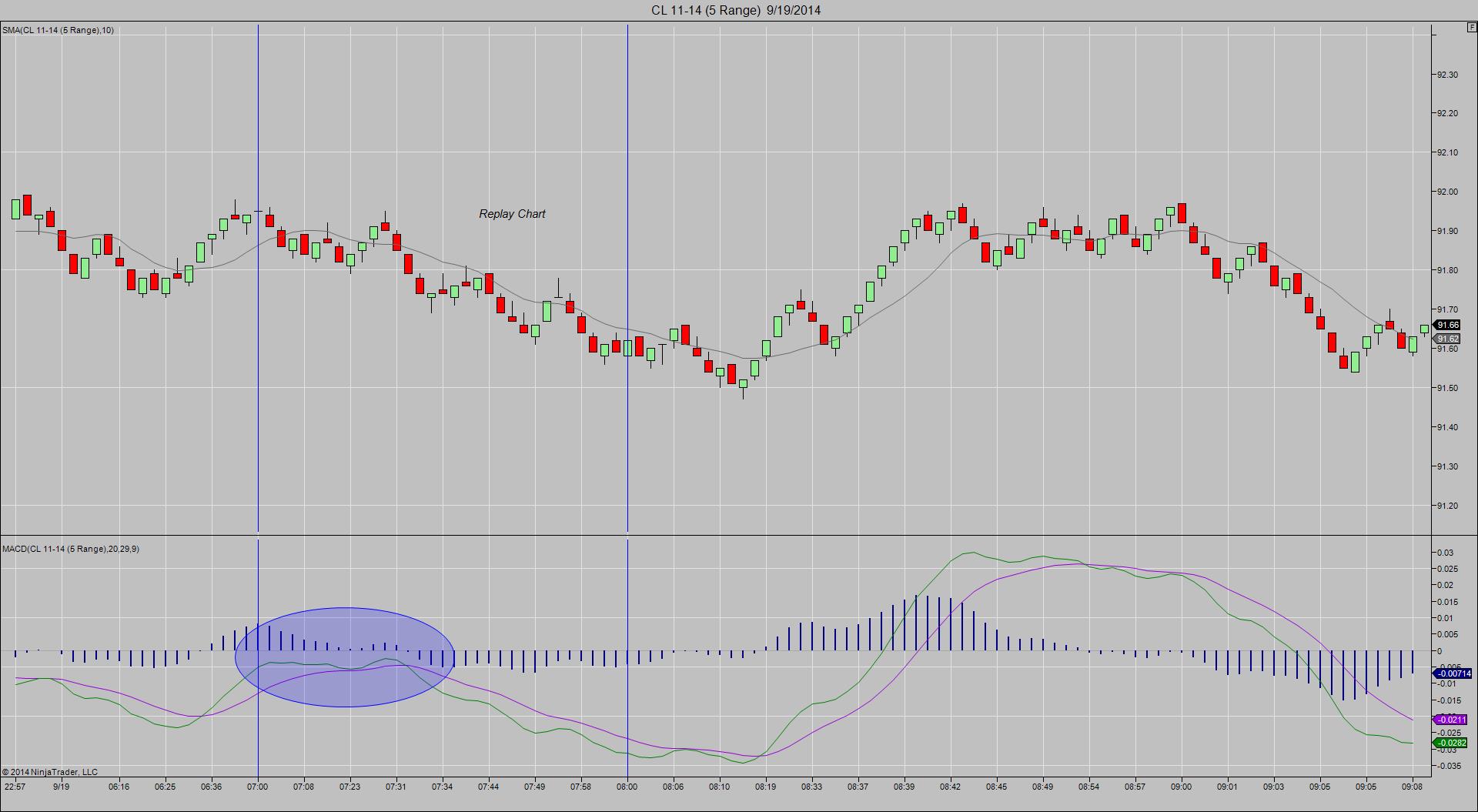 Note that on the replay chart the MACD fast and slow line are below the zero line and above on the live chart at the beginning of the session.