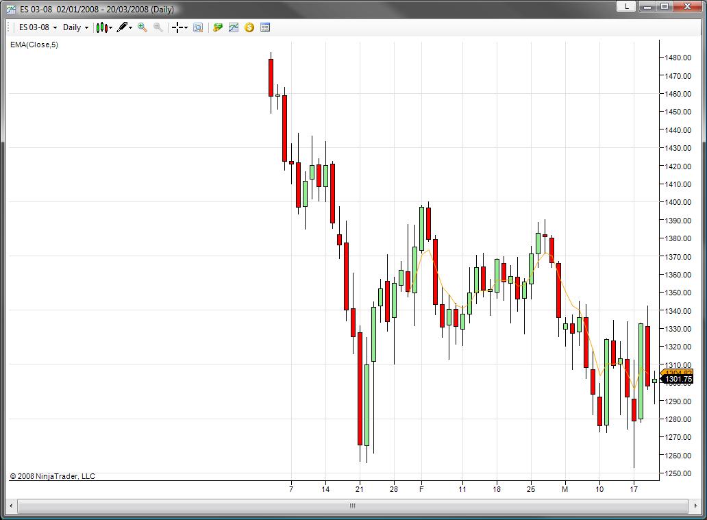 Anyway, I have also just noticed another bug. This one you should be able to replicate very easily. Again, just call up the ES 03-08 from 01/01/2008 to current date... and plot and EMA(5) on it... Notice the bar that the indicator starts plotting on th chart... It should start 5 bars in, but it actually starts 21 bars in. I have no idea if this is connected with the offsetting date problem.... But I've just been trying to debug my own indicator to see why it wasn't appearing sooner on the chart and it seems that it's not just my indicator.