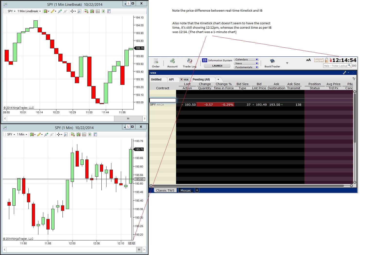 See attached a bitmap showing the data issue from today. This is not the backfill issue per se, but it is probably related. As can be seen on the screenshots, it appears that the Kinetick realtime data is lagging behind the current price data, as shows in IB. IB's price data was definitely correct, I checked other quote sources, too. In this case, the delay was about 2 minutes, but earlier today I had a case when I observed more that 5 minutes of delay. After I reloaded the historical data on the chart, it suddenly jumped forward, but it was still delayed by a minute or two.