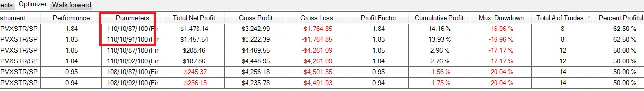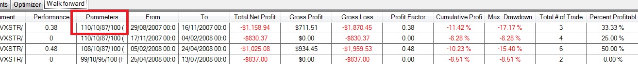 Hi Patrick, thanks for coming back so quickly. I think you seem to be agreeing with my previous post, but I in fact don't believe that is what Ninjatrader actually does. As an example, I am attaching 2 screenshots of a WFO - 1st one being the optimizer section, 2nd one Walk Forward. I have set 'keep best no of results' to 2. So, in the first screenshot, you can see the 2 best optimized parameter sets are 110/10/87/100 and 110/10/91/100. But in the walk forward, only the top parameter set (110/10/87/100) is used.My question originally was - how can I do the walk forward for both my parameter sets (110/10/87/100 and 110/10/91/100)?