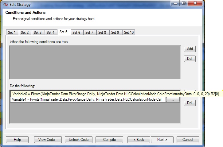 I need to set the profit target as the Pivot S2 for shorts or Pivot R2 for longs. In order to do so, I use two variables as Image1 shows.