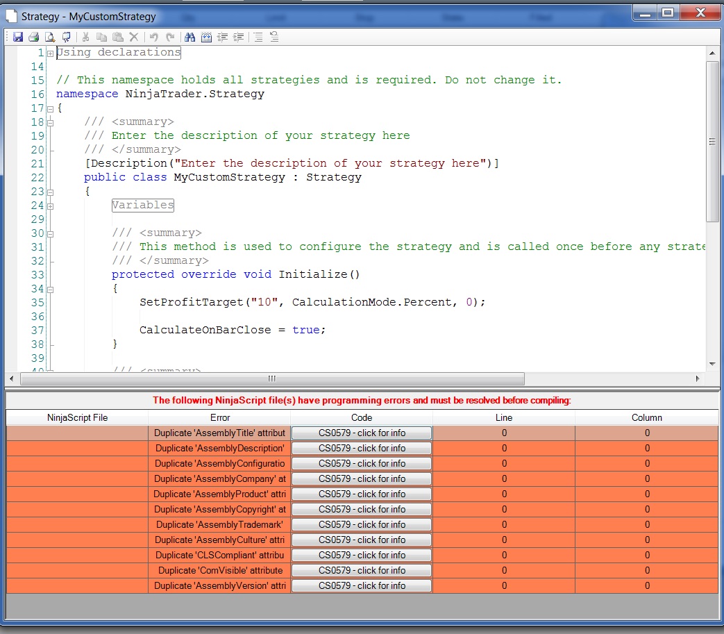 I keep getting the error when trying to write a strategy using the strategy wizard, even with a very simple SMA crossover.
