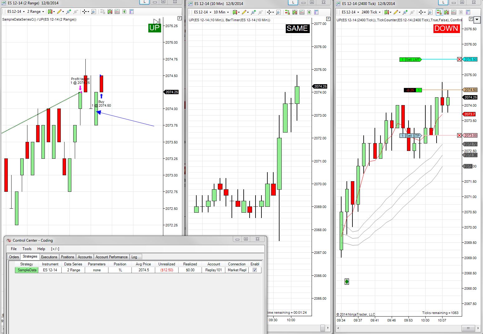 My main chart is RANGE, upon which I have loaded the strategy. I added 5 MIN and 1200 TICK. I only want to execute the trade on the close of the RANGE bar.