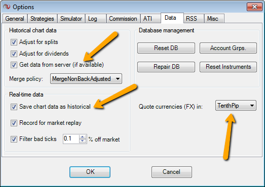 I've attached a screen shot of my "Options / Data" set up. As you see, apart from not being tenth pip for currencies, I match yours where you indicated.