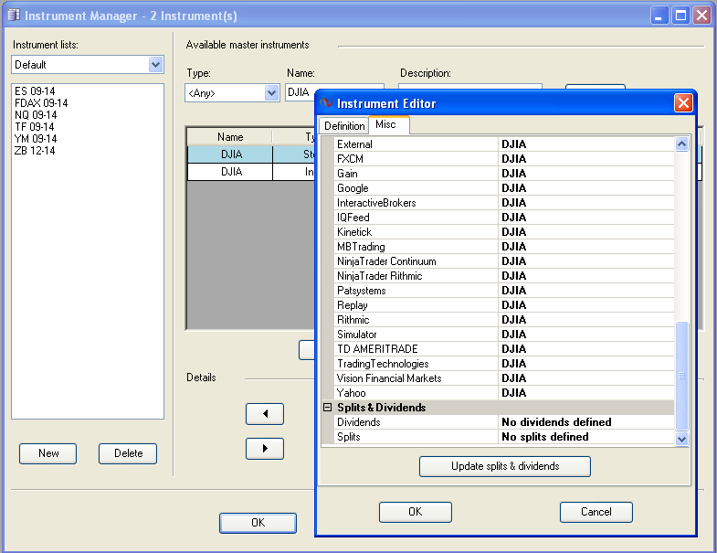 Instrument Manger shows 2 DJIA & 1 DJI pre-installed.