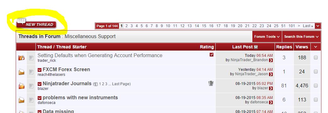 The New Thread button is at the top left of the forum section. Just to the left of all the pages.