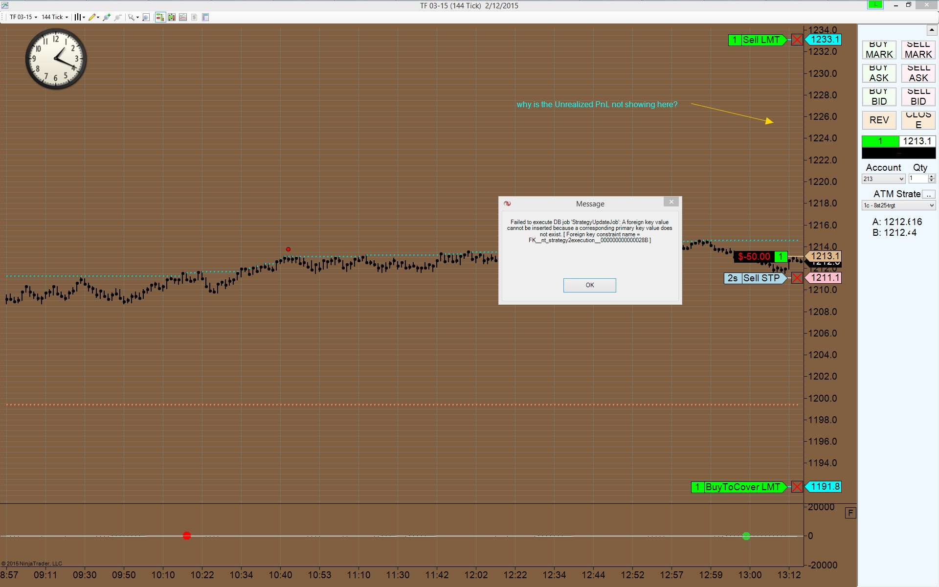 That fixed things. However, I am still not getting the box on Chart-Trader immediately below the two position boxes to show the Unrealized PnL. It is just black with a few red dots in the middle. It was working previously. What happened? The chart with chart-trader is correctly set to the correct account number and shows the correct position flags on the chart itself.