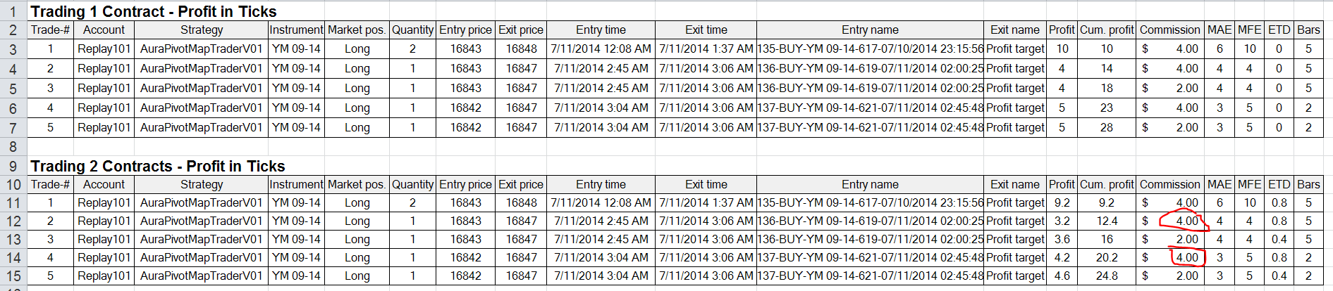 When the strategy trades 2 YM Contracts at a time, and NT must manage the execution of the trade using partial fills, the commission calculation does NOT look right to me. Please see the attachment rows 8-15.
