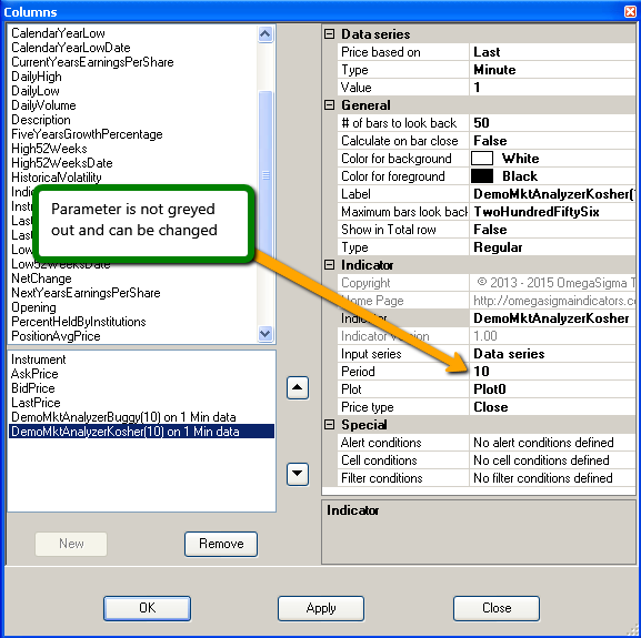 I was trying to set up a scanner using the Market Analyzer, and I could not change any of the parameters of an indicator that I was adding.