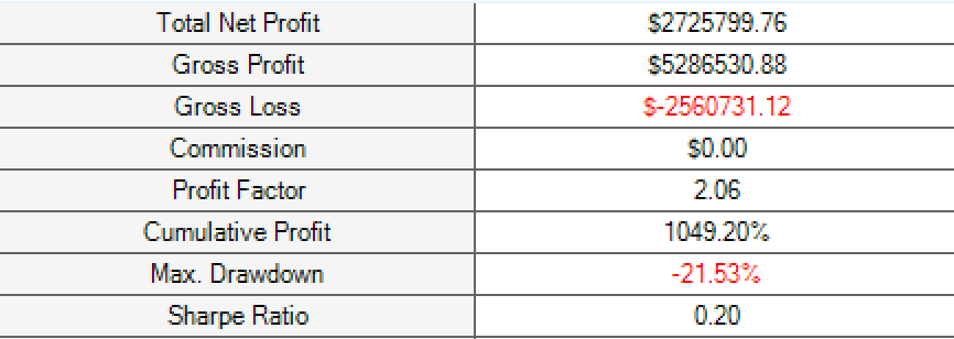 The Cumulative Profit is calculated as PRODUCT(1 + profit / entry price) of all trades - 1. This is not the same as Total Net Profit which is the Gross Profit - Gross Loss.