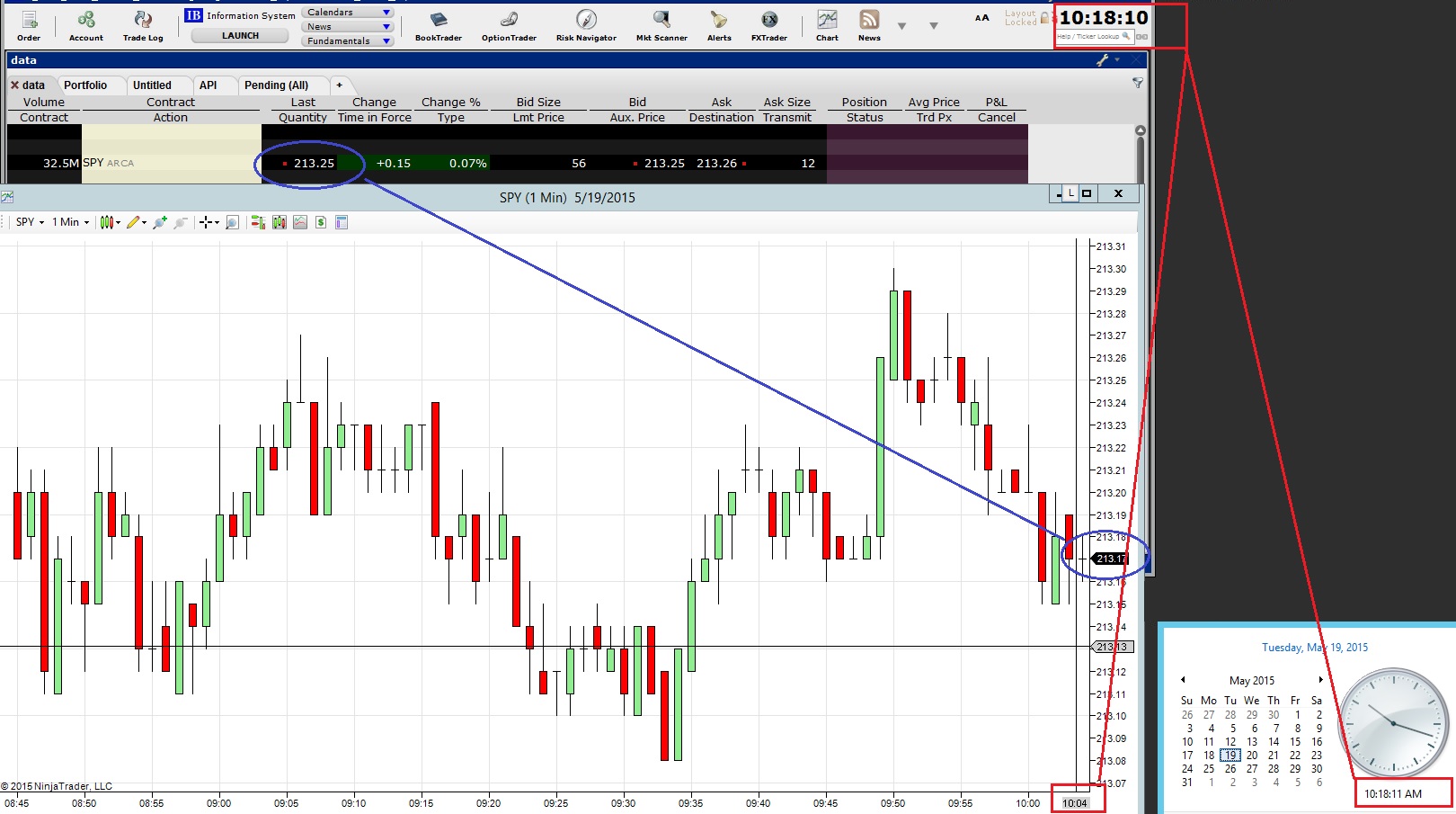 I have a paid Kinetick real-time subscription, the PC time is accurate and matches IB TWS clock. In NinjaTrader, I had only one connection to Kinetic, and pulled up a 1-min chart of SPY.
