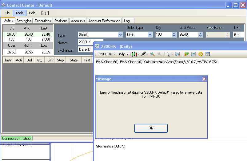 Here is a Hong kong stock that i want to chart from yahoo connection. The exchange is HKSE (Hong Kong Stock Exchange) and is not available on the list. I chose default and 2800.hk as the symbol and it doesnt work. What do i have to do to get this hong kong stock to plot on my chart? Thanks