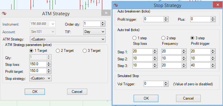 • The tick value for the YM is '1' and the Point Value is $5. So in the Stop Strategy dialogue, in 'Step 1' of the Auto Trail, the Profit trigger indicates that when you have a $100 profit (20 ticks x $5), the Stop Loss will then trail your position by $100 (20 ticks x $5).