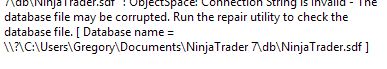 To first troubleshoot this, let's rename your database file. Please go to your Documents -> NinjaTrader 7 -> 'db' folder. Within the 'db' folder, please rename the 'NinjaTrader.sdf' file to 'NinjaTraderOLD.sdf'