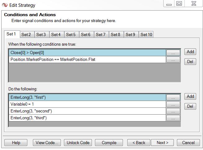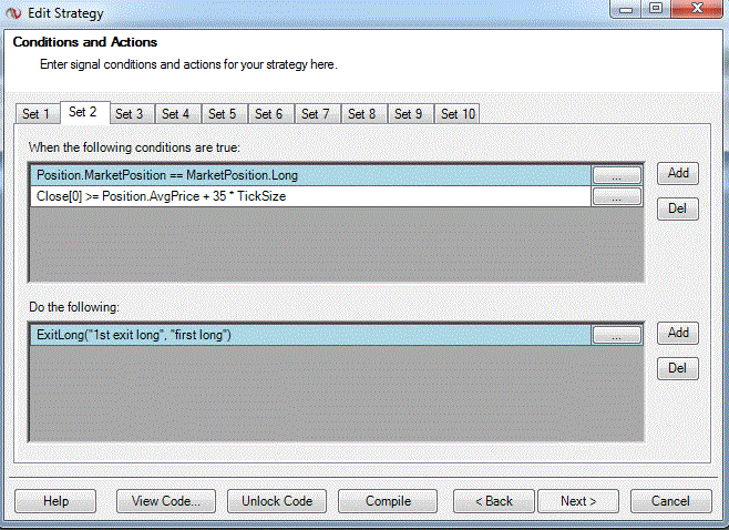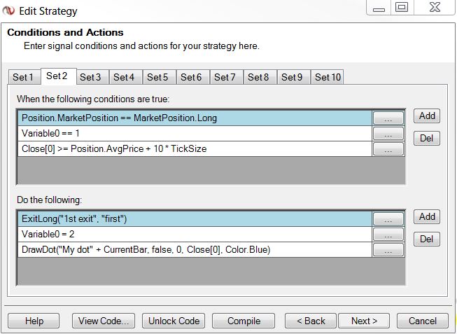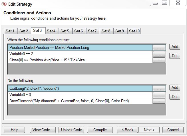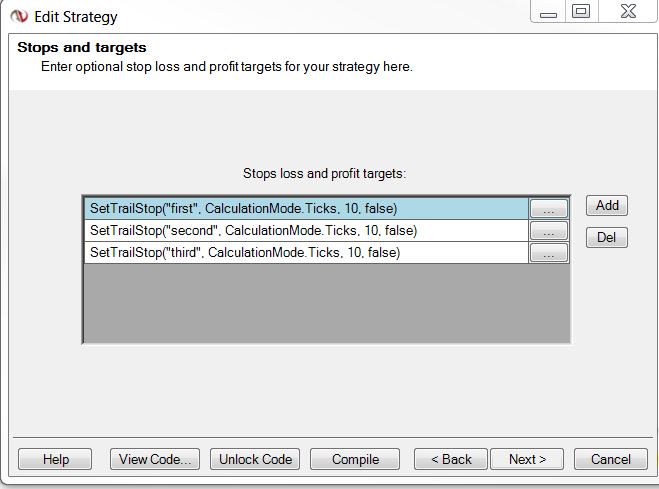 Strategy gets executed and i am long 9 contracts, i want to exit 3 at 10 ticks 3 at 15 ticks and leave the last 3 as runners with a trailing stop.