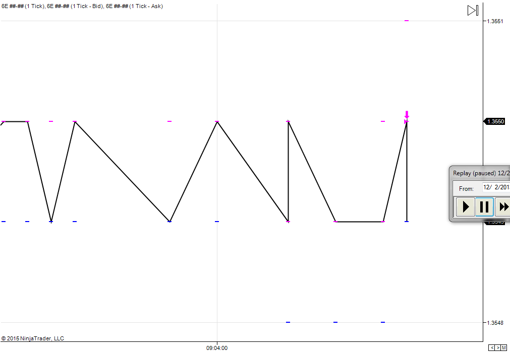 This screen shot using the replay data you provided shows the bid & last trade price at 1.3550 and the ask at 1.3551.