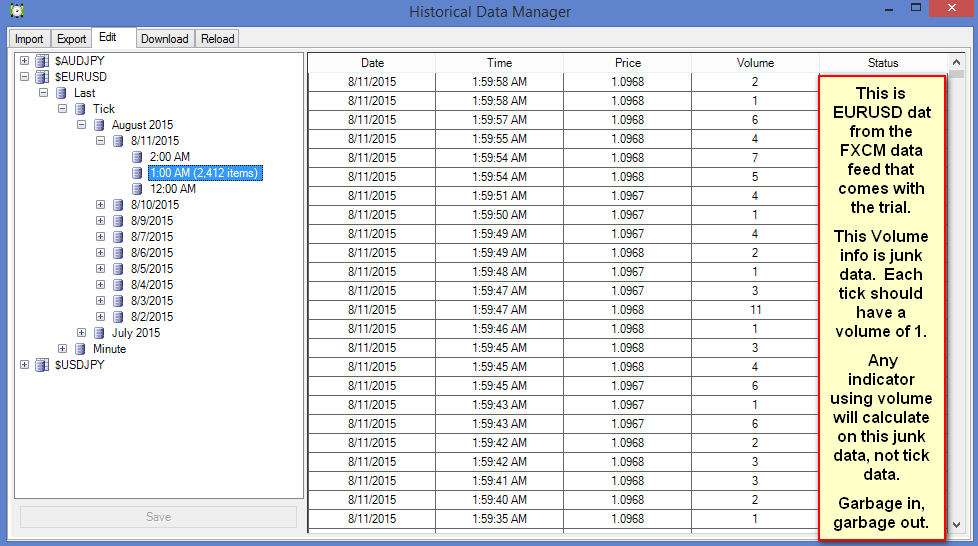 Both the FXCM data and MB Trading have seemingly random numbers reported as volume, which gets picked up by any indicator using volume. Tick volume has its uses, if inferior to real volume, yet this junk data reported as volume has n use at all, that I can see.