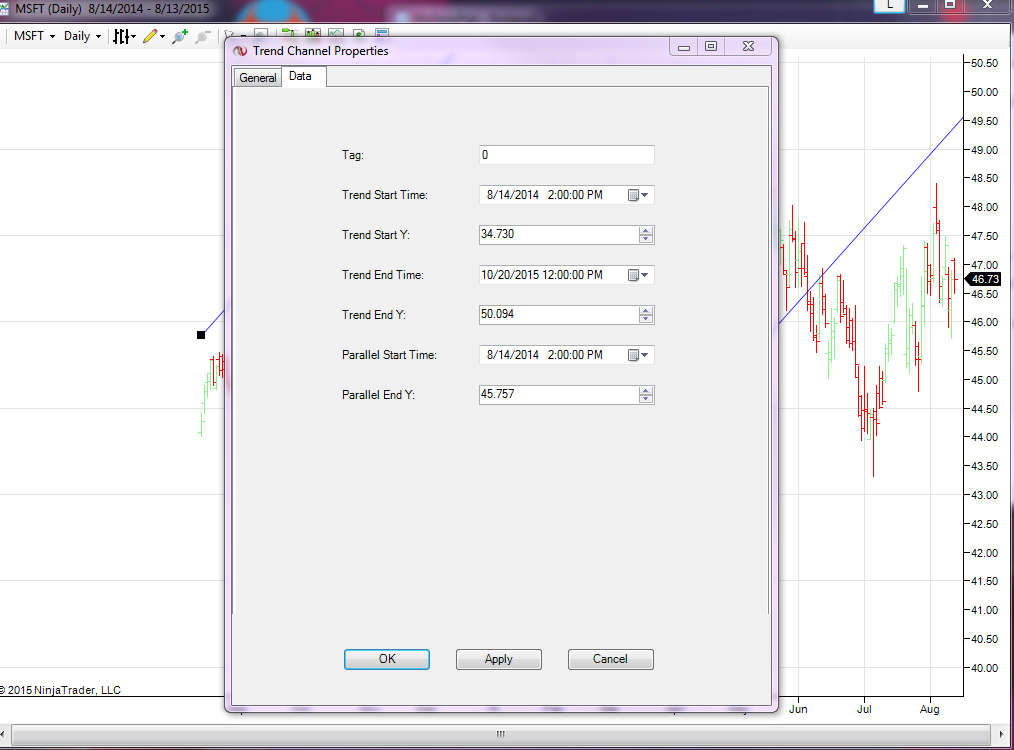 When I test a Trend Channel in a daily chart and then switch to a 15 minute, it does not change these values.
