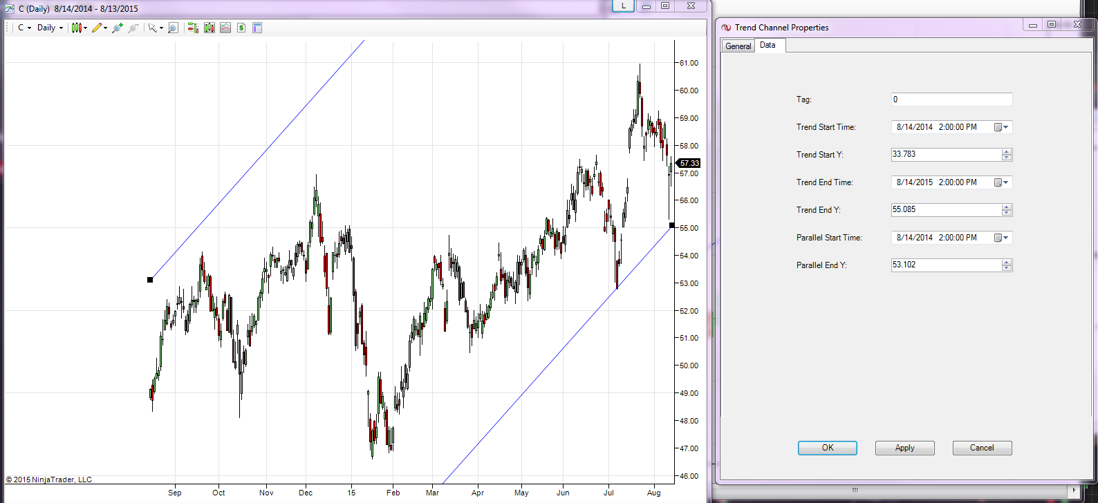 When I draw a Trend Channel on a 60min bar chart and then swap to a 5min trend channel, the trend channel may move if I do not have enough 5 minute bars loaded. The trend channel seems to want to recalculate itself based on the available bars irrespective of where I first drew it.