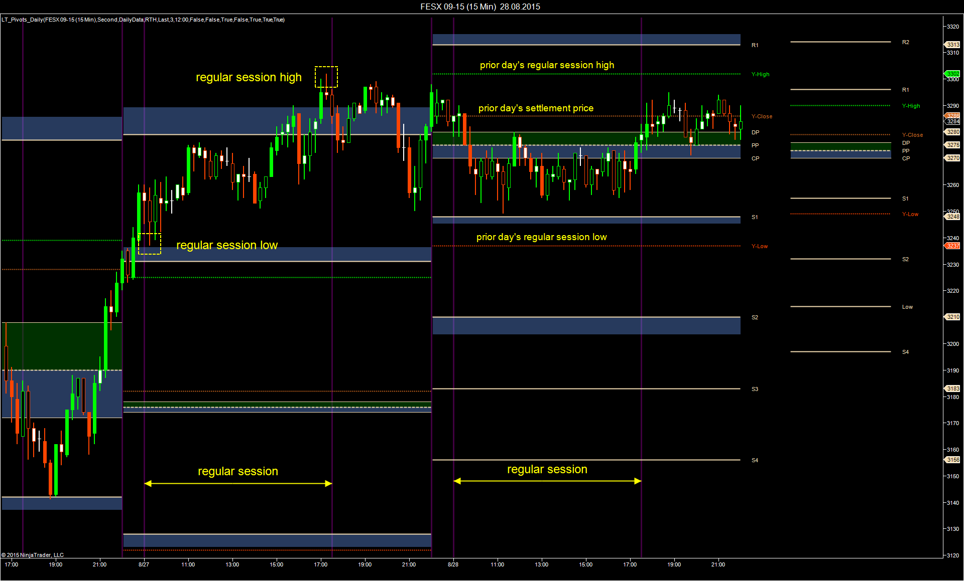 Now let us show an application of this data. If you wish to display regular session pivots for FESX, you would calculate them from the regular high, the regular low and the official closing price (settlement price). Attached is a chart which shows regular session pivots (floor pivots) for FESX 09-15. A simple pivots indicator is available in the download section (search for SessionPivots).