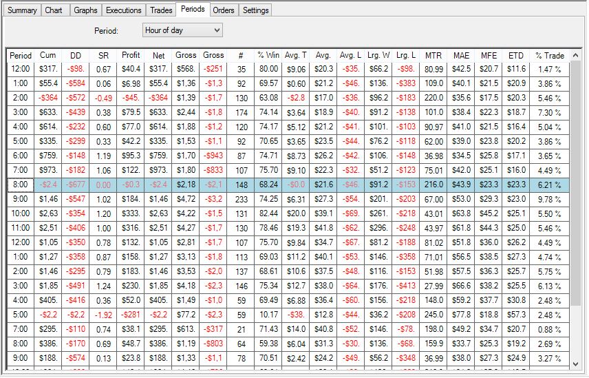Look at the highlighted row: 8:00 AM. That row lists the number of trades to be 148. My question is were those 148 trades selected based upon Entry Time or the Exit Time of the trade(s).