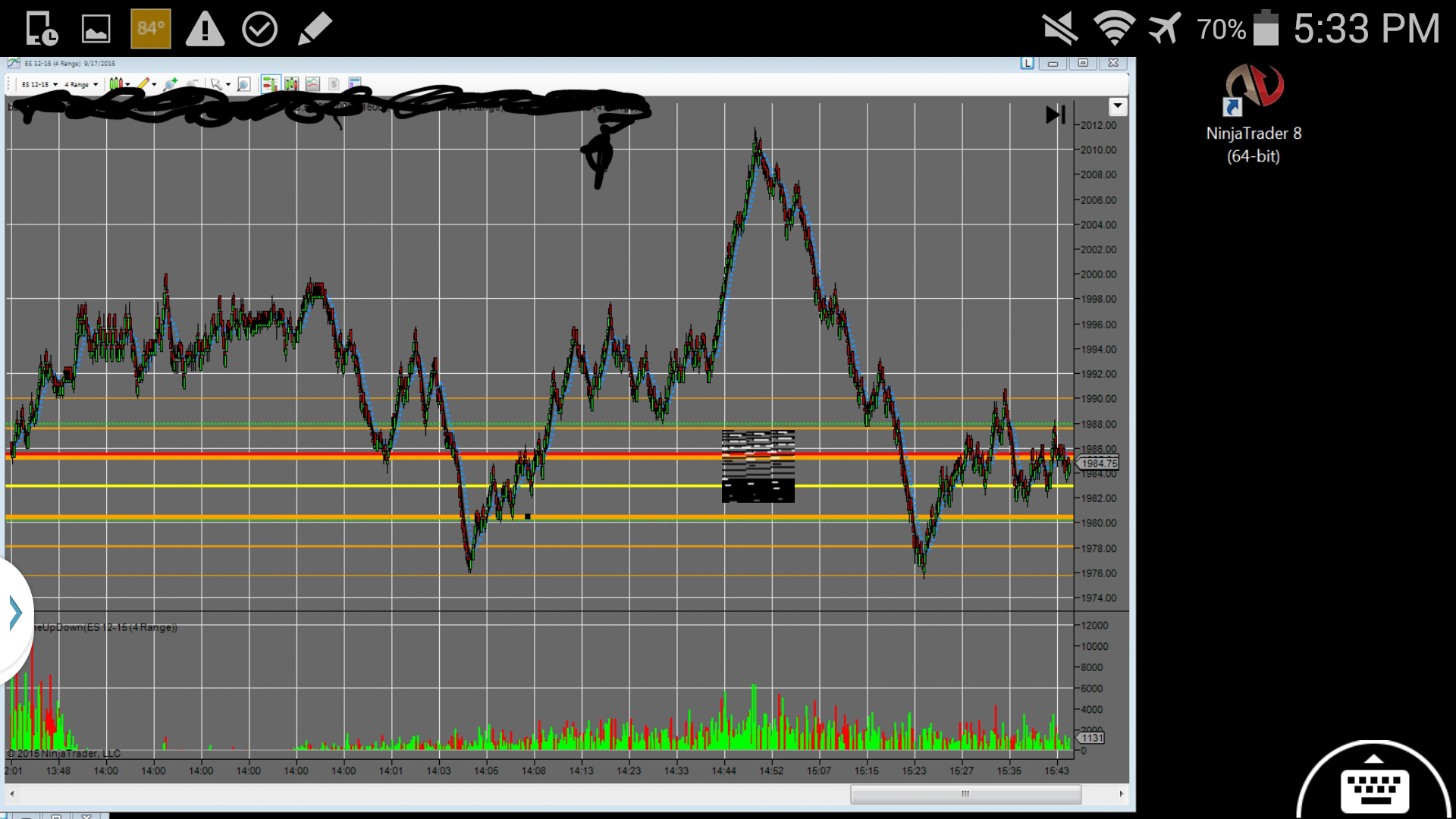 Of course I checked with ONE clean chart open only (NO indicators, just a 5-min-chart of the ES 12-15, no other charts and/or instruments) - did not help.