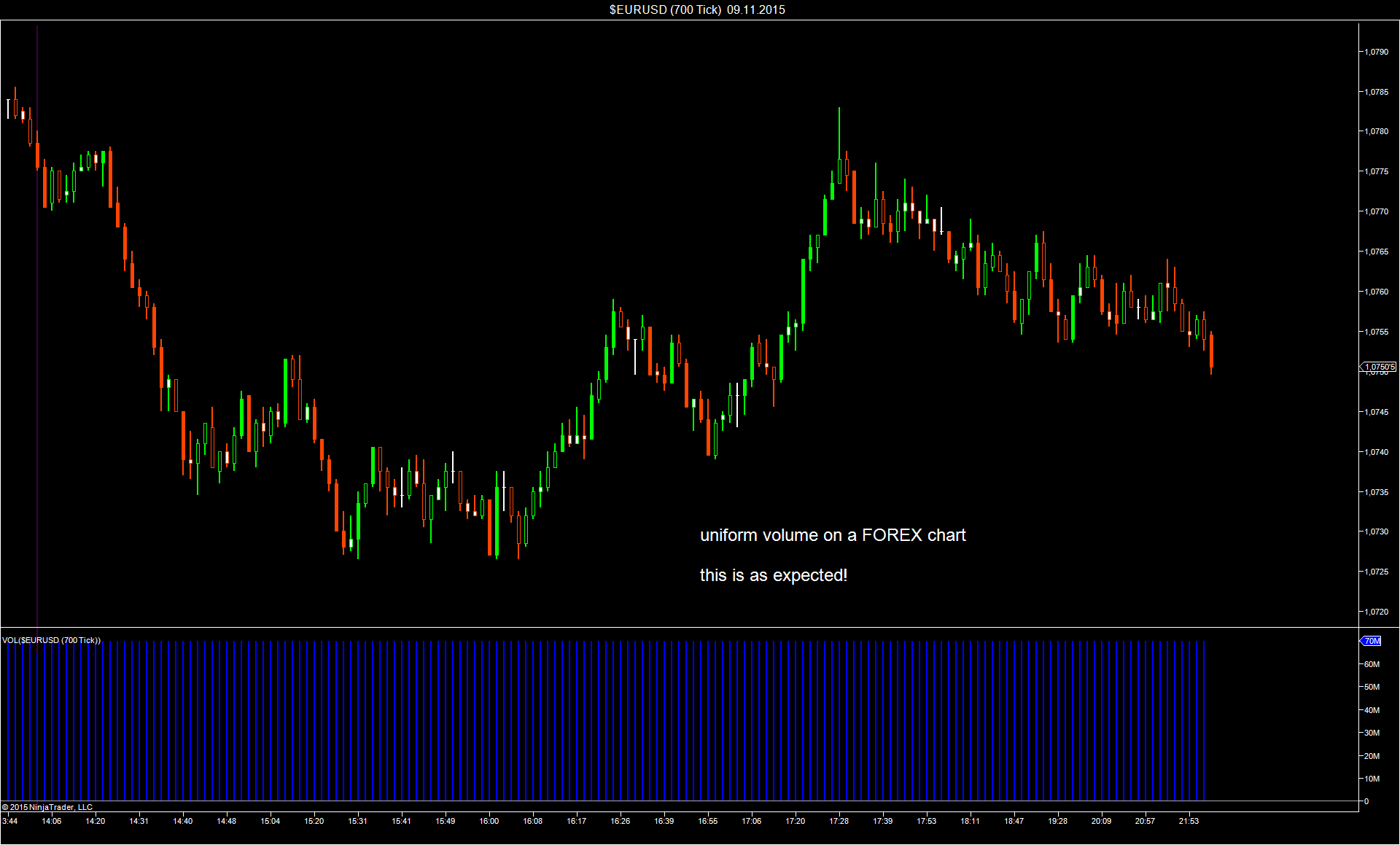 Originally posted by investorcat View PostMy data feed comes from 'Continuum' (Ninjatrader B.) I'm trading the YM on a 700 tick chart, and when I add volume to the chart I only get a series of volume bars with epual height. Could you please try to setup a 700 tick chart and then add volume to it?