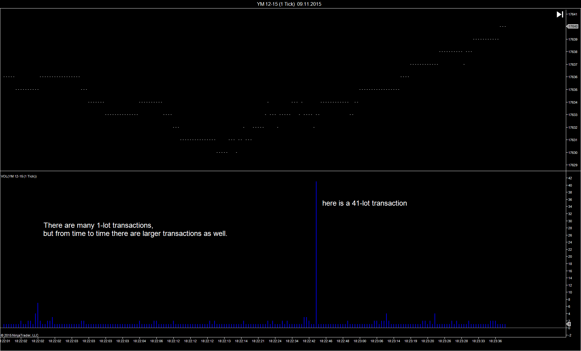 But the volume shown for YM is real volume, not tick volume. The question here is how volume is being reported by the exchange. If you have a large order, it is typically crossed with a whole bunch of smaller orders. The ticks refer to the smaller orders, therefore they are mostly broken down. For YM there are no really large orders, therefore the volume bars that you will notice are the result of a statistical fluctuation of orders sizes between 1 and 10 lots.