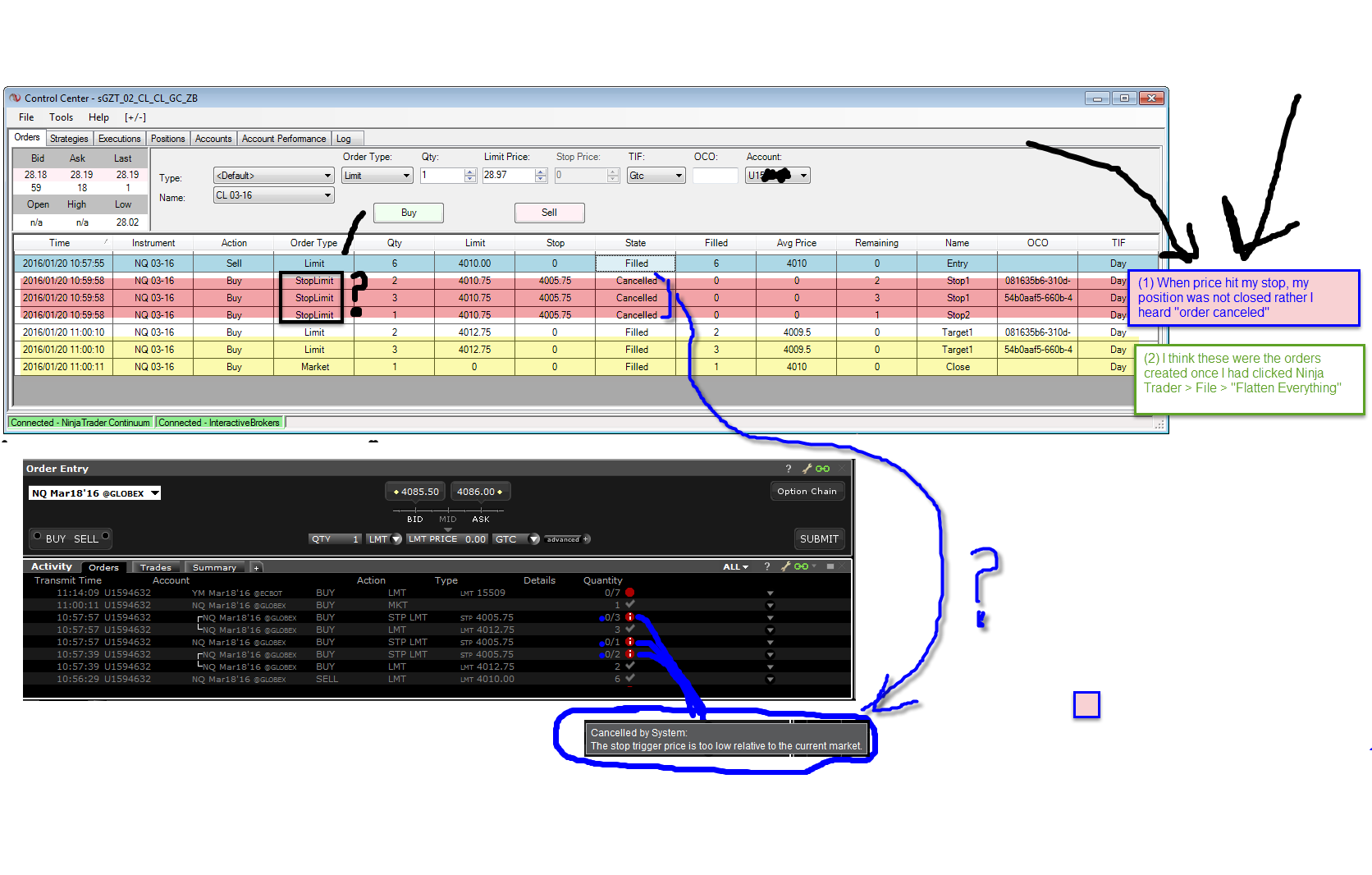 I've also attached a screenshot of my NT and IB orders... I've just noticed that in IB it says "Cancelled by System: The stop trigger price is too low relative to the current market price".