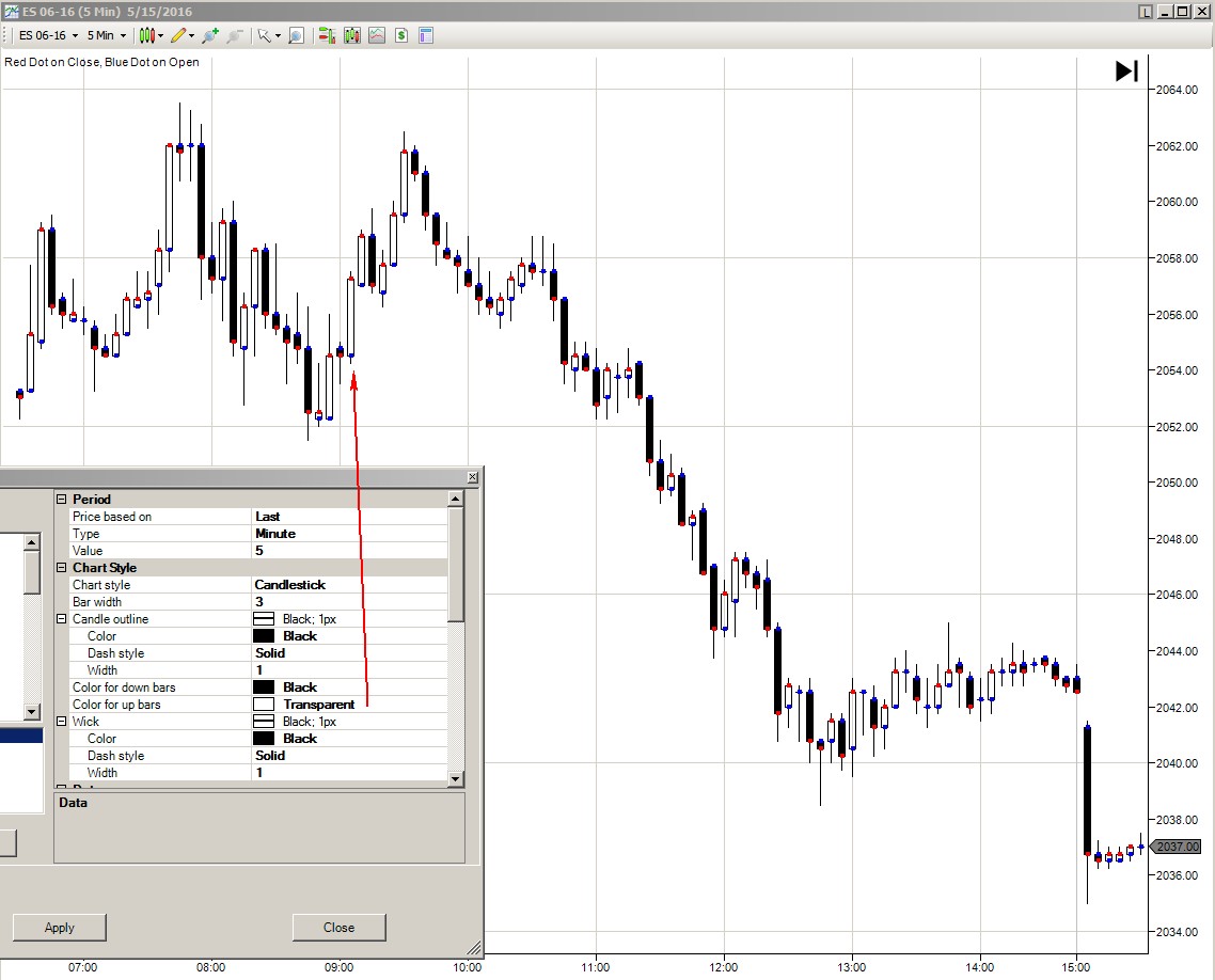 sbtyme - It appears that you want the candle plot to have clear candles on up bars and filled candles on down bars. This is available with the standard Candlestick Chart Style, just change "Color for up bars" to be Transparent. See attached screen capture, as an example with the following settings:
