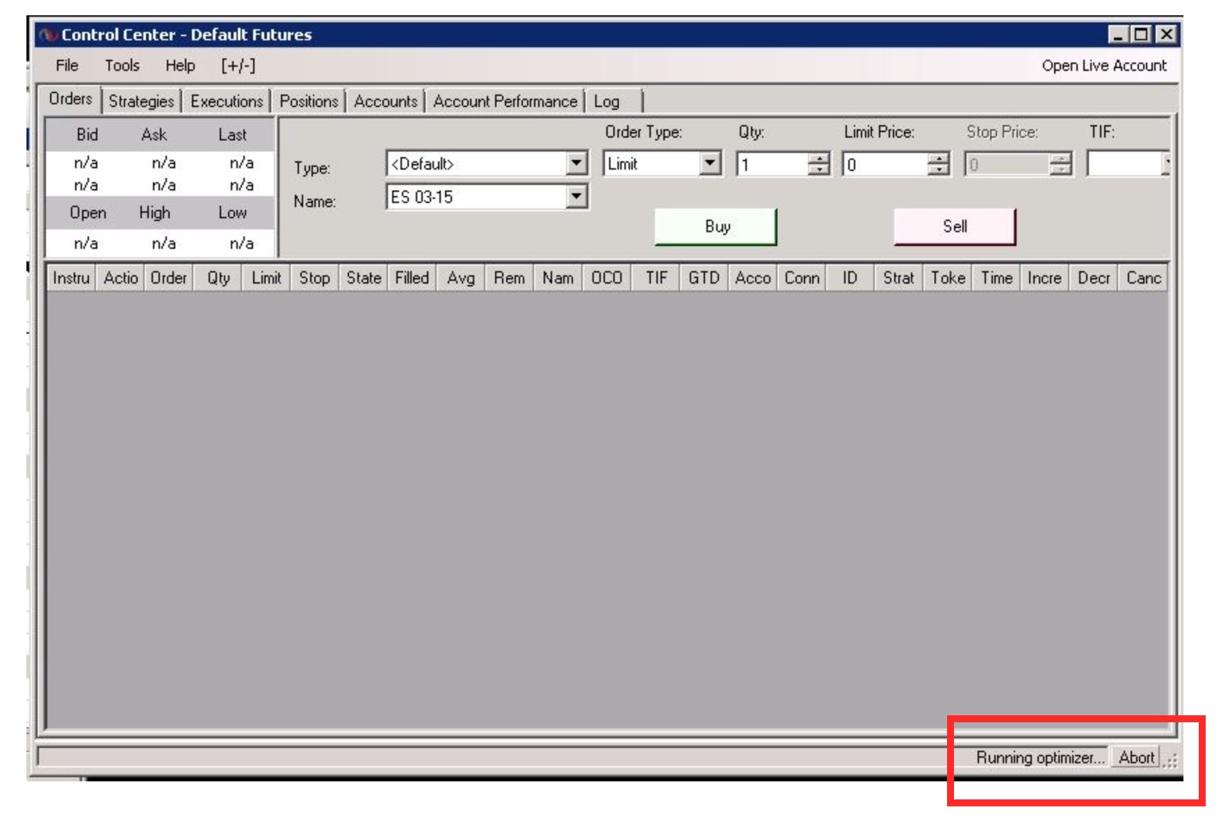 While running an Optimization in Ninjatrader's Strategy Analyzer I can see in the bottom right hand corner of the Control Center a verification that the Optimization is running (as shown in the area circle in Red in attached screenshot 1.jpg).