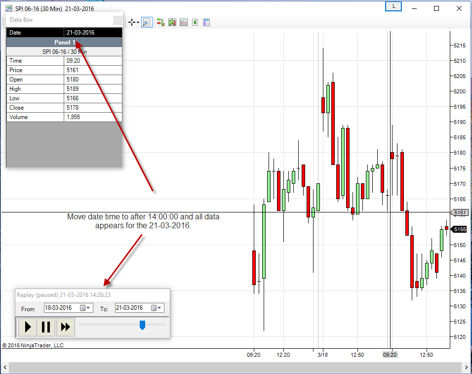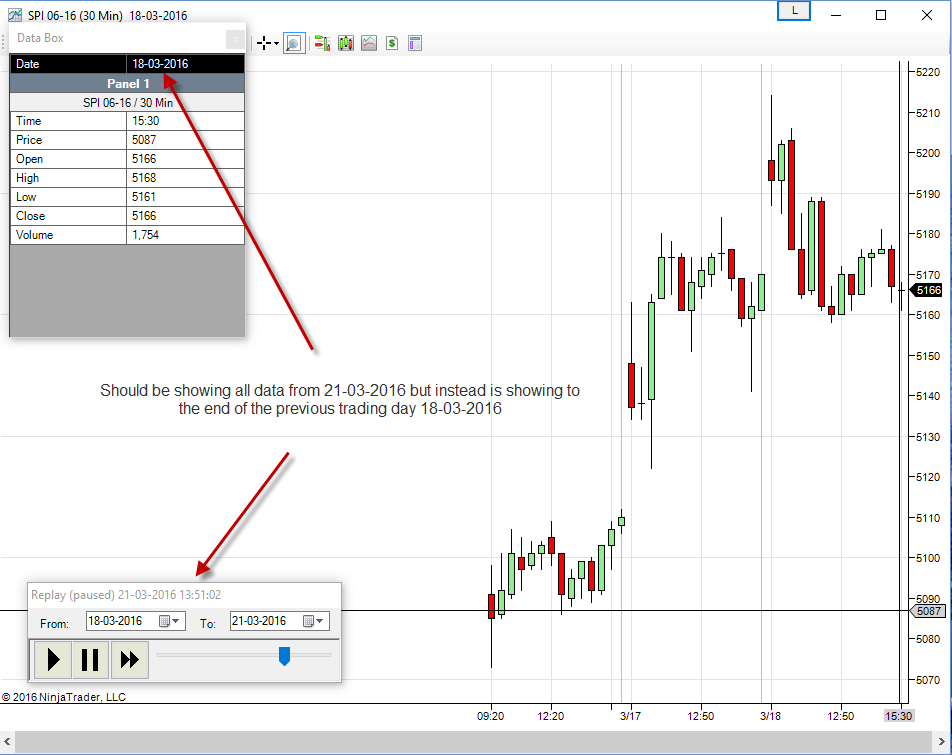 Start market replay from 8:00 on 21-March-2016 and no data shows until the replay date/time gets to 14:00 on 21-March-2016. Once it passes this time - all data for the day 21-March-2016 appears on the chart.